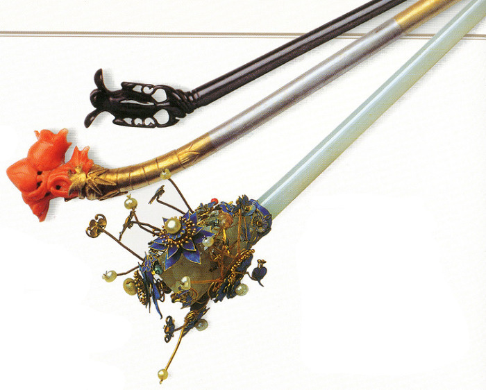 ★ 비녀 : 여성의 머리 장신구. 쪽을 지거나 가체를 고정하는 도구. 재료와 형태에 따라 다양했으며 신분과 꼐급, 계절에 따라 구별하여 꽂았다. 서민은 나무나 뿔로 만든 비녀를 꽂았으나 혼례 때는 화려한 비녀를 꽂았다. 위로부터 물소뿔로 만든 흑각 석류 비녀(24cm), 산호 비녀(19cm), 백옥 초롱 영락 비녀(24cm).