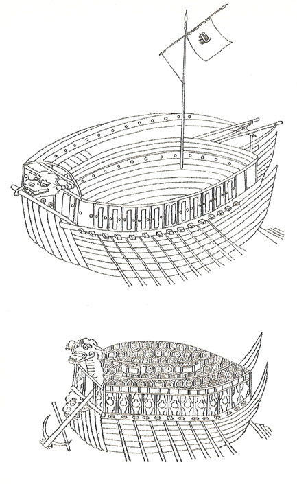 ★ 거북선 : 귀선(龜船)이라고도 한다. 조선 시대의 군함으로, 판옥선의 갑판 위 외형 전체에 뚜껑을 씌운 뒤 나무판으로 덮고 무수한 송곳과 칼을 꽂아, 적병이 뛰어오르지 못하도록 했다. 선수부에는 용머리 모양의 충각 겸 포문을 만들어 화포를 쏘고, 선미부에는 거북이 꼬리를 세우고 역시 화포를 쏘아, 전후좌우 모든 면에서 화포를 쏠 수 있었다.